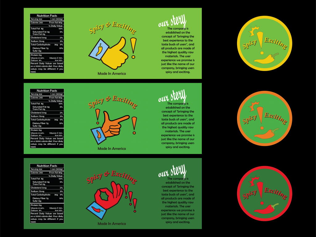 Packaging design for salsa sauce. Including wrapping paper, bottle cap, self-designed brand, and three different types of logos corresponding to three different flavors (slightly spicy, normal spicy, extra spicy)