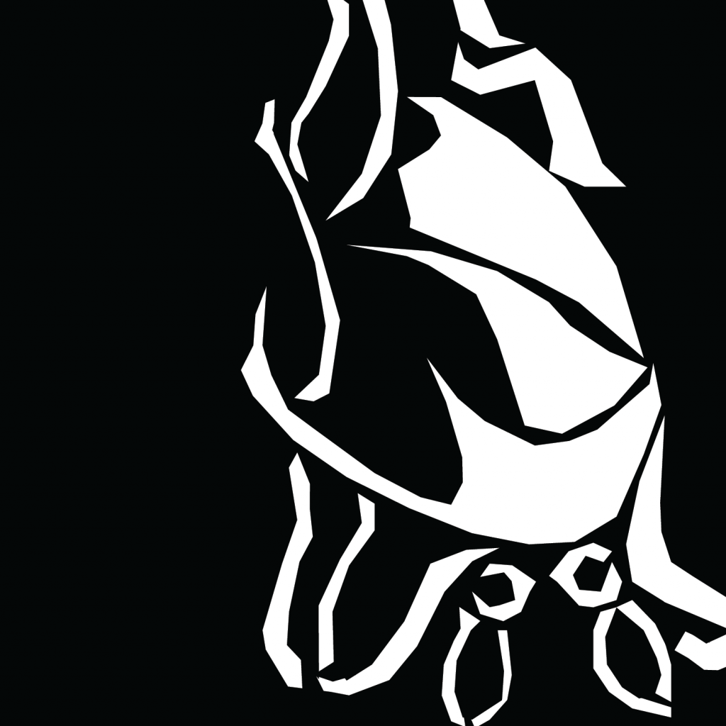 A bat made of positive space and negative space. On a black background, use white elements to form each part of the bat. In the use of positive/negative space, leaving space between elements and elements can better form a whole.