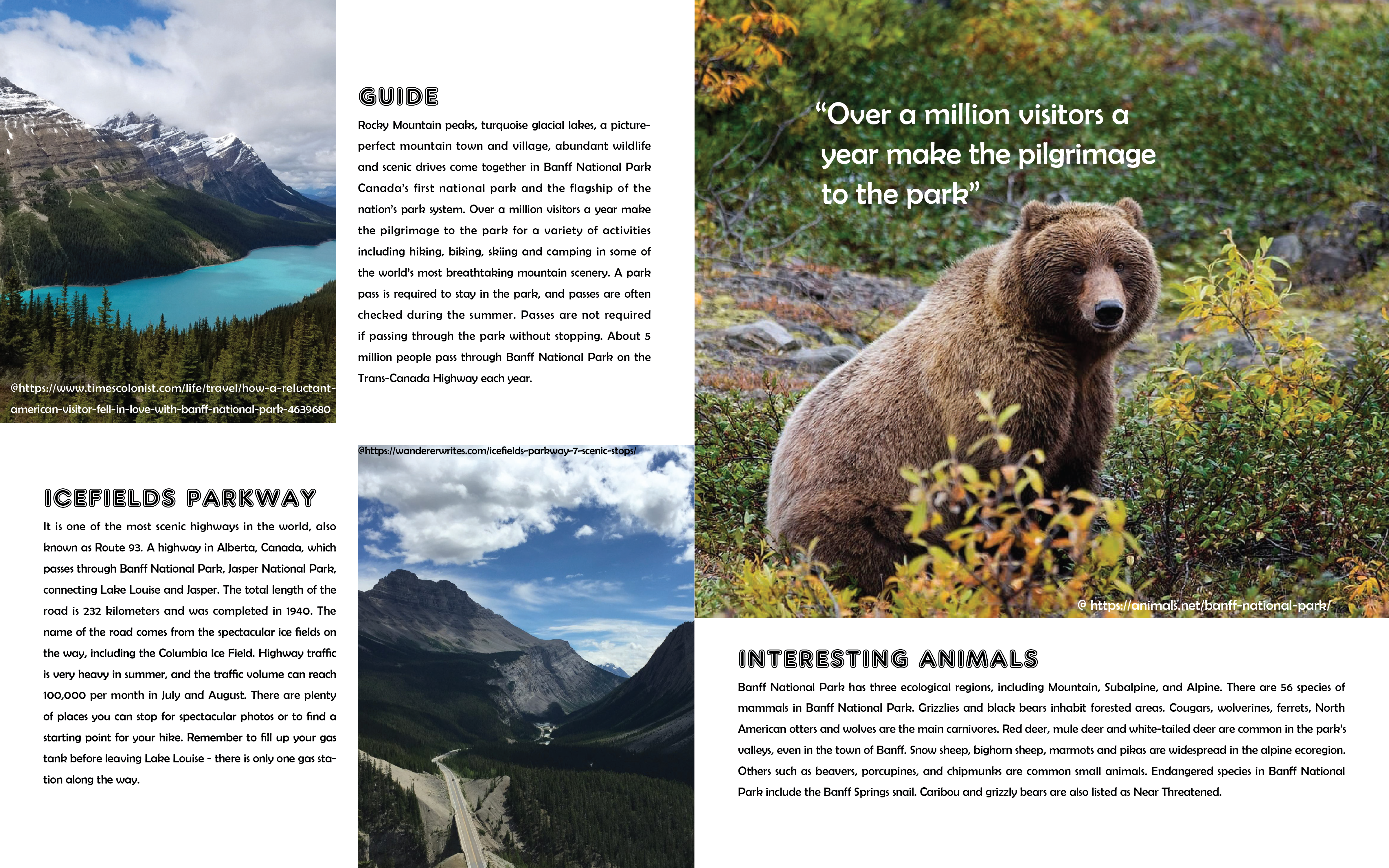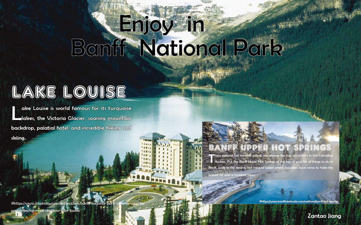 A magazine designed for “Amazing Places”. The cover includes the name of the magazine, the location to be introduced (Banff National Park), and some brief introduction.