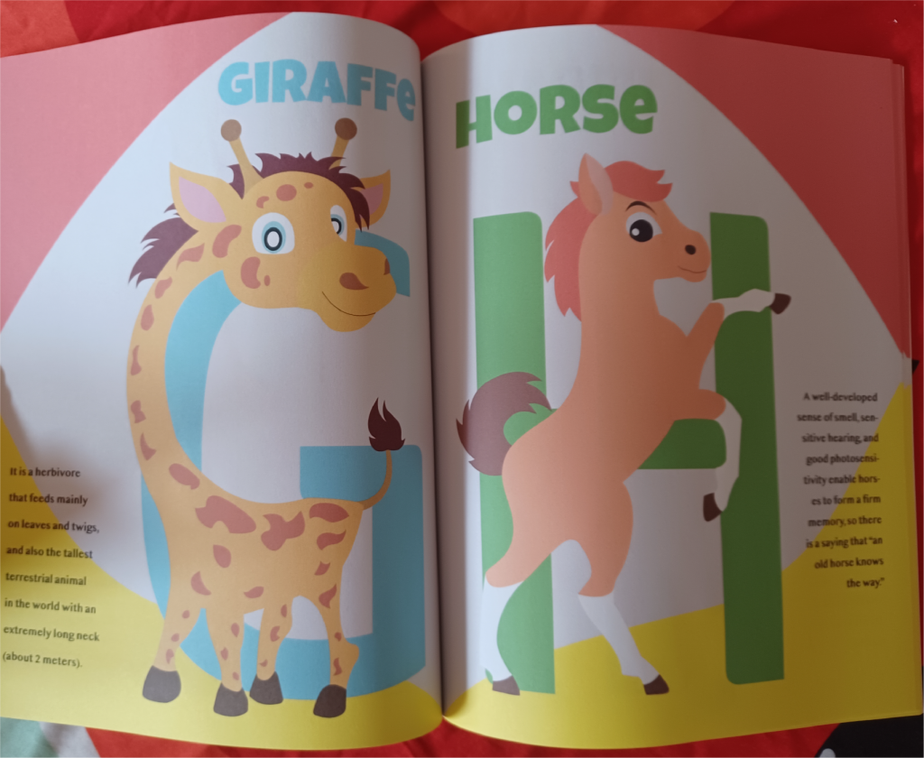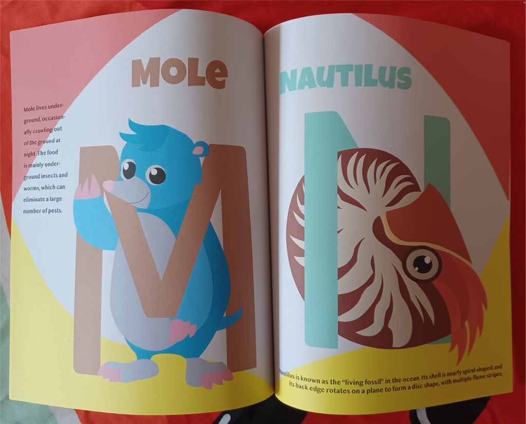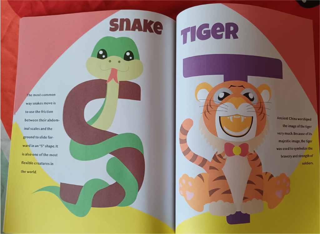 This is an A to Z book designed for children. I design with animals in mind. Based on the 26 letters from A to Z, I chose an animal for each letter (with the corresponding letter as the first letter, e.g. S for snake). And when I design the specific shapes of the animals, I try to make them look cute and their movements fit the letters.