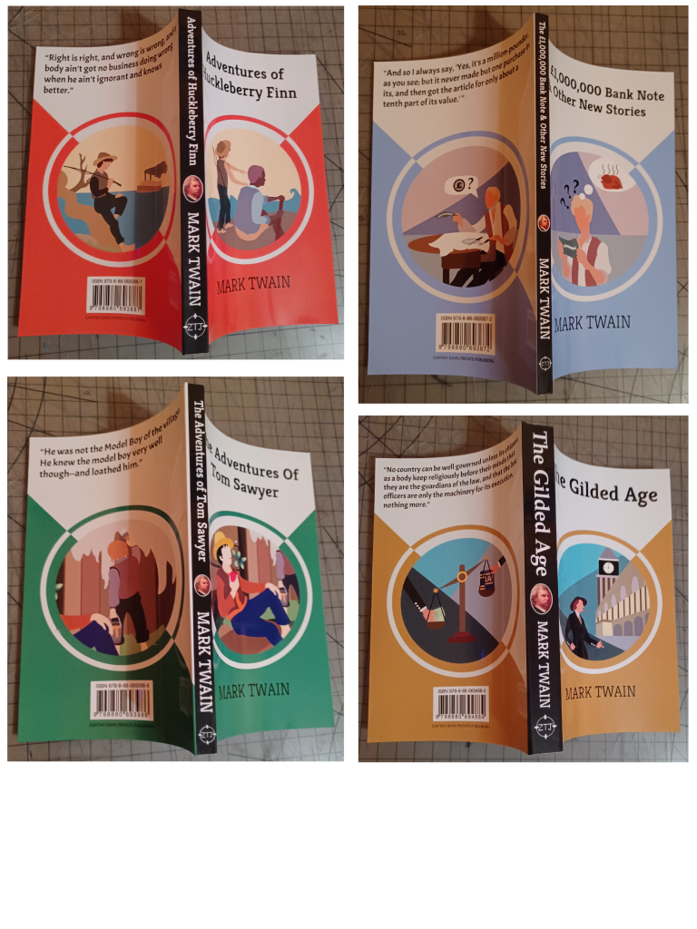 I selected a few of Mark Twain’s novels and published them as a publisher (using InDesign’s Blurb plug-in). The content of the novel comes from the Internet, but the book cover and spine are all designed by me. I tried to keep the cover design of the four books consistent to show that they are from the same author (like a series).